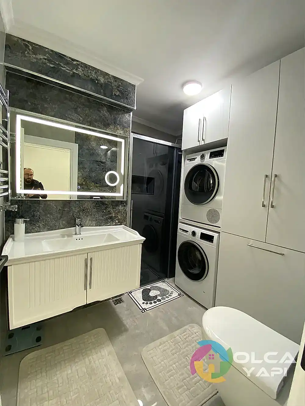 Banyo duvar ve zeminlerinde Kütahya Seramik 60×120 Alaska Gri granit, dekor olarak Qua Seramik Martins Marble Dark tercih ettik. Vitra gömme rezervuar, Vitra Integra Rimex ince kapaklı asma klozet ve 100 cm Sagra beyaz banyo dolabı monte ettik. Banyo bataryası, lavabo bataryası ve tepe duş seti olarak Artema Flo S ve Tema ürünleri kullanıldı. Banyo aksesuarları olarak Beta serisi tercih edildi. Duşakabin olarak teknesiz Beta krom menteşeli sistem füme camlı uygulandı. Banyo için krom havlupan ve menfez, çamaşır makinesi dolabı olarak beyaz MDF lam kullanıldı.