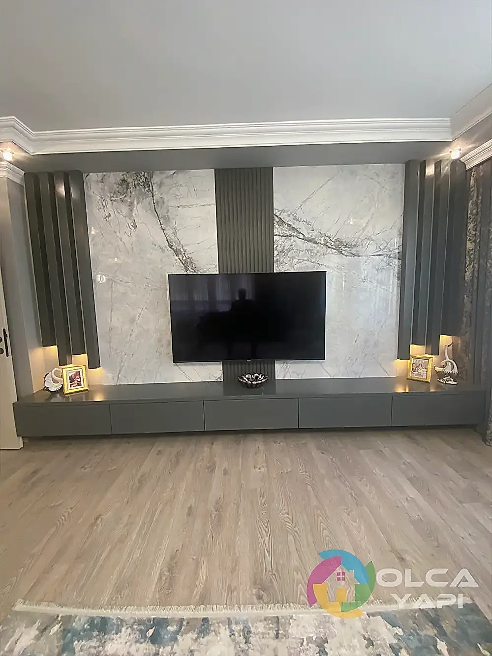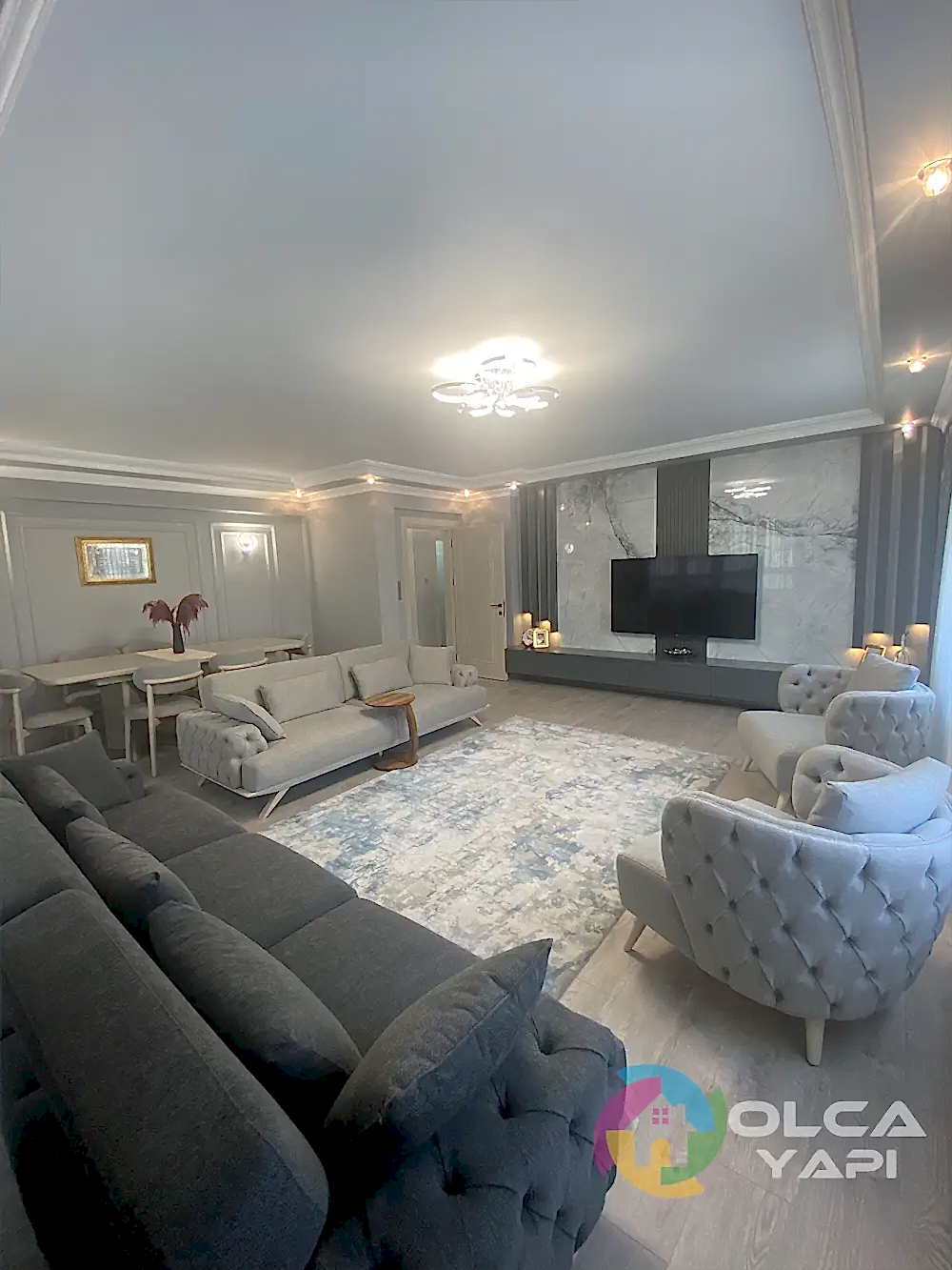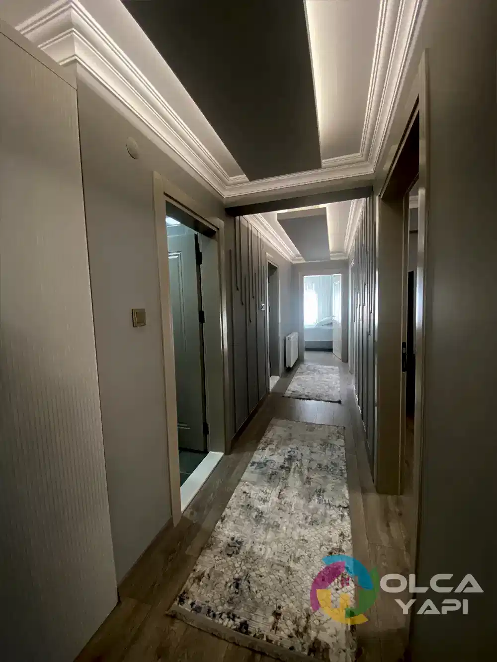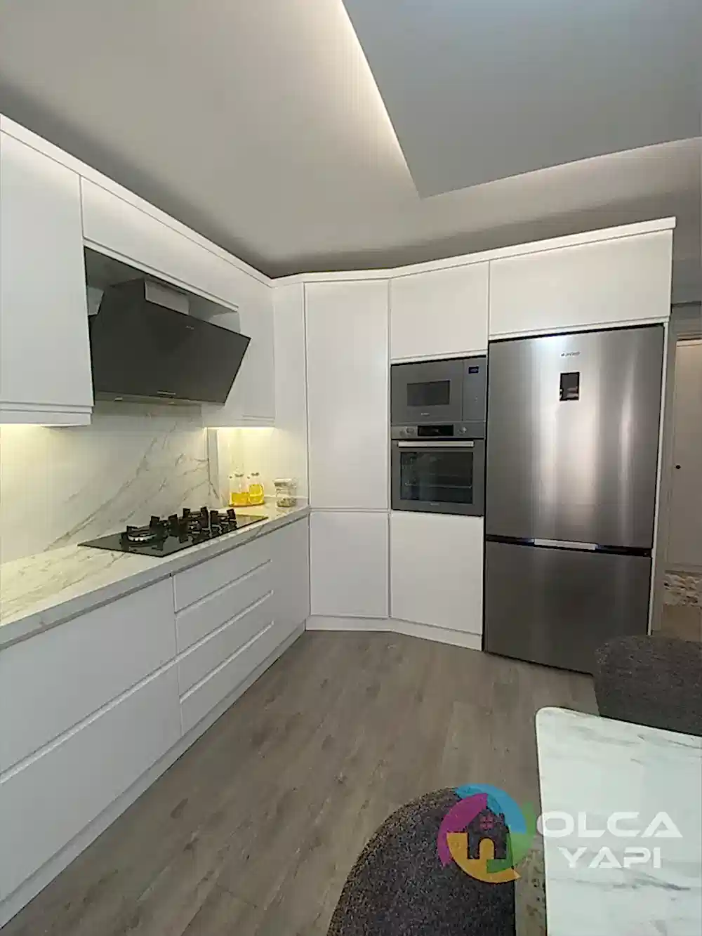 Kerim Bey’in dairesinde kapsamlı bir tadilat gerçekleştirdik. Mevcut mutfak dolapları sökülerek, yeni tesisat işlemleri yapıldı. Tüm dairenin prizleri yenilendi. Balkona şeffaf camlı balkon uygulandı ve çelik kapı monte edildi. İç kapılar gri lake olarak yenilendi. Mutfak ve salon tavanına saten alçı uygulanarak ışık bandı ve gün ışığı LED eklendi. Tüm dairenin duvarları ve tavanları boyandı. Balkon zeminine seramik döşendi, diğer zeminlere parke kaplandı. Mutfakta yeni dolaplar, Calacatta Borghini porselen tezgah ve Franke evye ile armatür kullanıldı. TV arkası, antre ve salonda çıtalama yapıldı. Antreye özel üretim dresuar ve portmanto monte edildi. Salonda TV ünitesi ve yemek masası arkasına dekoratif uygulamalar yapıldı. Banyoda, WC’de ve ebeveyn banyosunda tesisatlar yenilendi, seramik döşendi, banyo dolapları ve aksesuarlar monte edildi. Ayrıca balkon dolapları tamir edildi ve vestiyer arka balkona taşındı. Salon için klima elektrik tesisatı çekildi.
