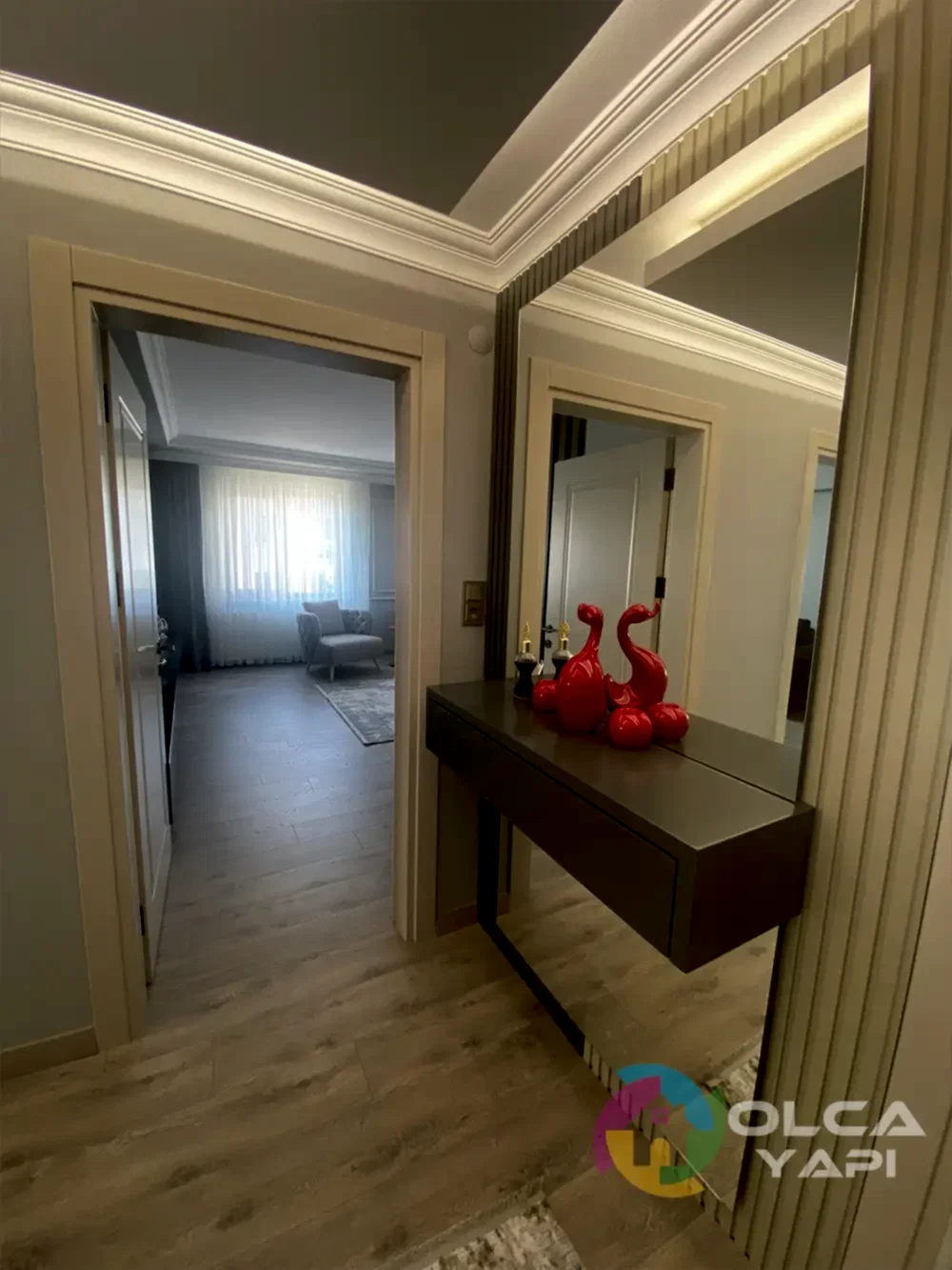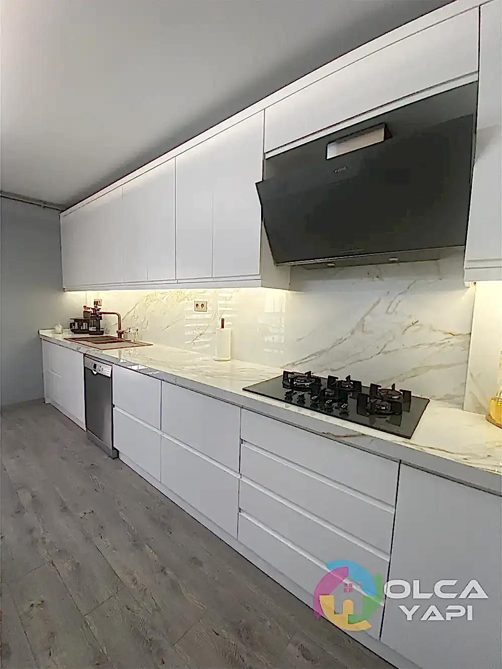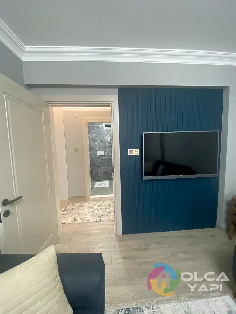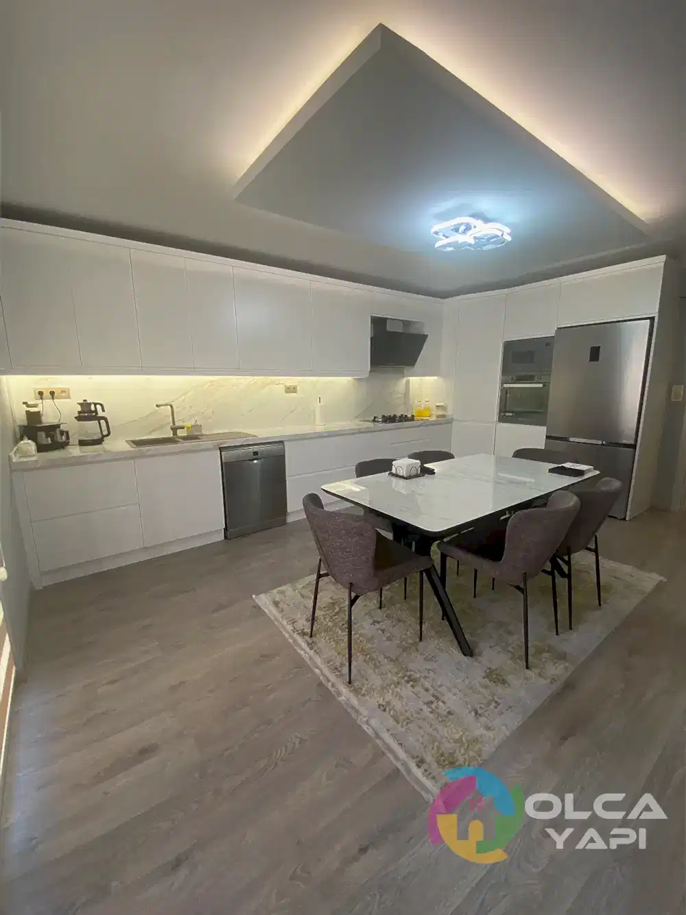 Kerim Bey’in dairesinde kapsamlı bir tadilat gerçekleştirdik. Mevcut mutfak dolapları sökülerek, yeni tesisat işlemleri yapıldı. Tüm dairenin prizleri yenilendi. Balkona şeffaf camlı balkon uygulandı ve çelik kapı monte edildi. İç kapılar gri lake olarak yenilendi. Mutfak ve salon tavanına saten alçı uygulanarak ışık bandı ve gün ışığı LED eklendi. Tüm dairenin duvarları ve tavanları boyandı. Balkon zeminine seramik döşendi, diğer zeminlere parke kaplandı. Mutfakta yeni dolaplar, Calacatta Borghini porselen tezgah ve Franke evye ile armatür kullanıldı. TV arkası, antre ve salonda çıtalama yapıldı. Antreye özel üretim dresuar ve portmanto monte edildi. Salonda TV ünitesi ve yemek masası arkasına dekoratif uygulamalar yapıldı. Banyoda, WC’de ve ebeveyn banyosunda tesisatlar yenilendi, seramik döşendi, banyo dolapları ve aksesuarlar monte edildi. Ayrıca balkon dolapları tamir edildi ve vestiyer arka balkona taşındı. Salon için klima elektrik tesisatı çekildi.