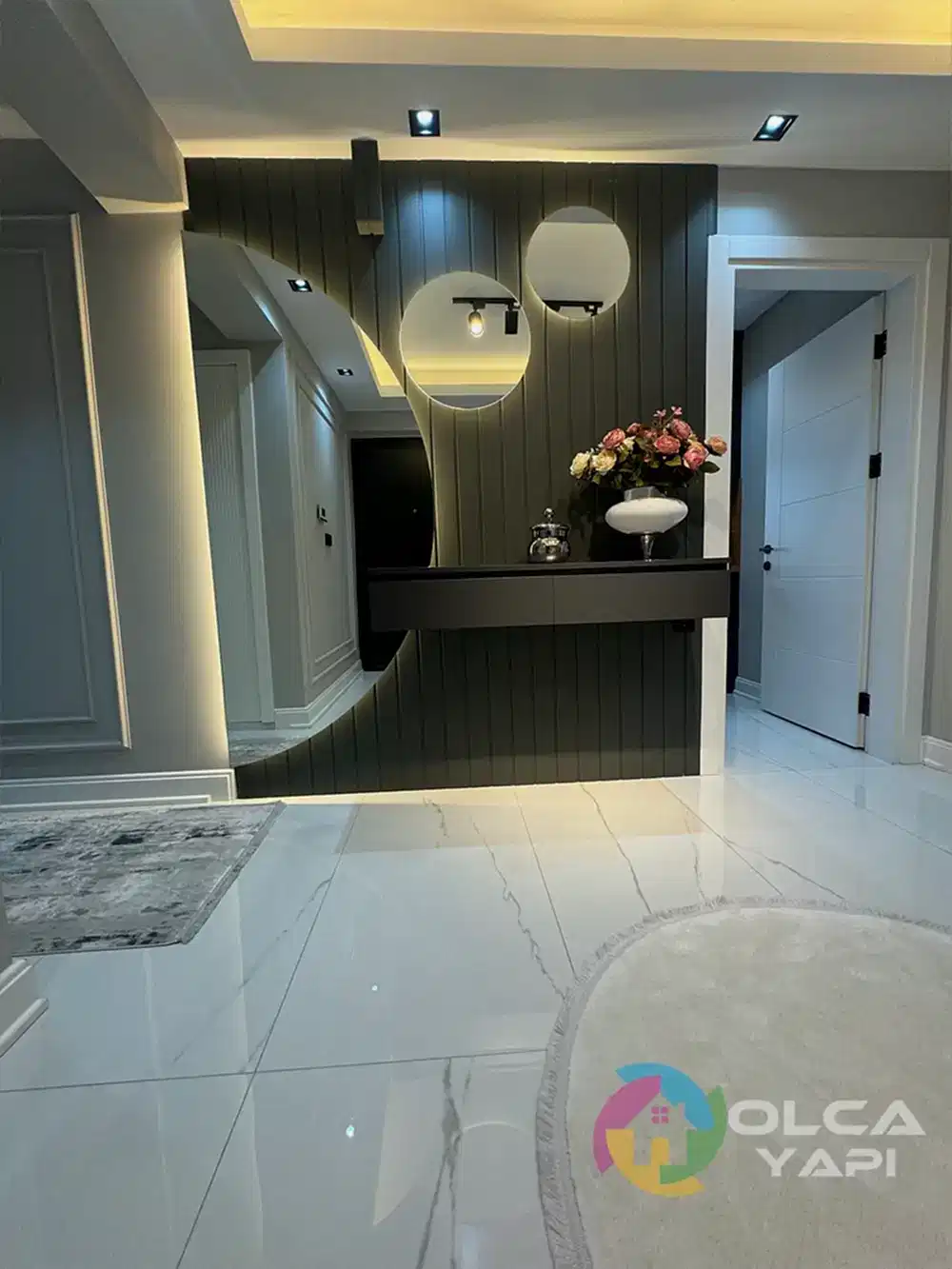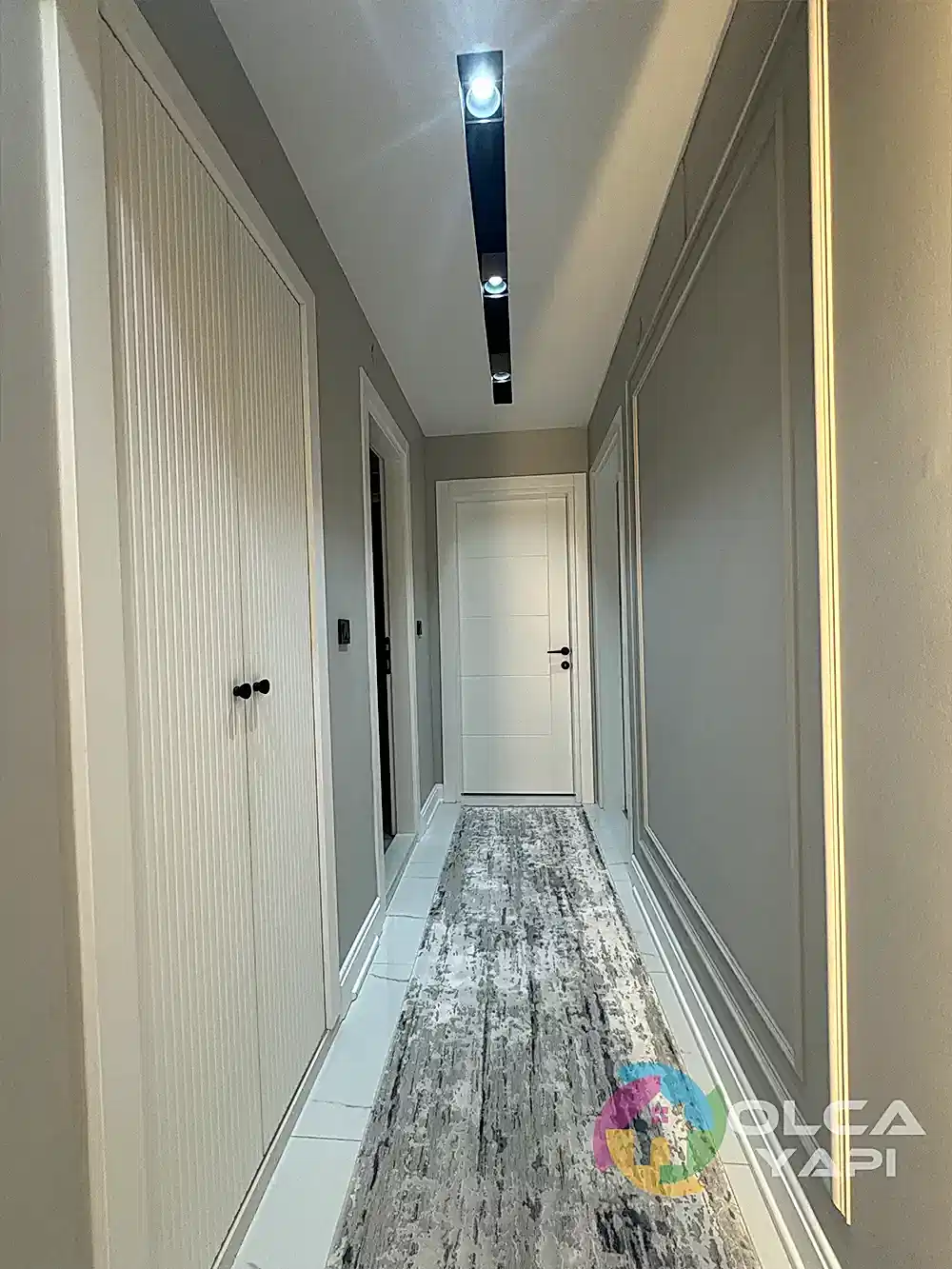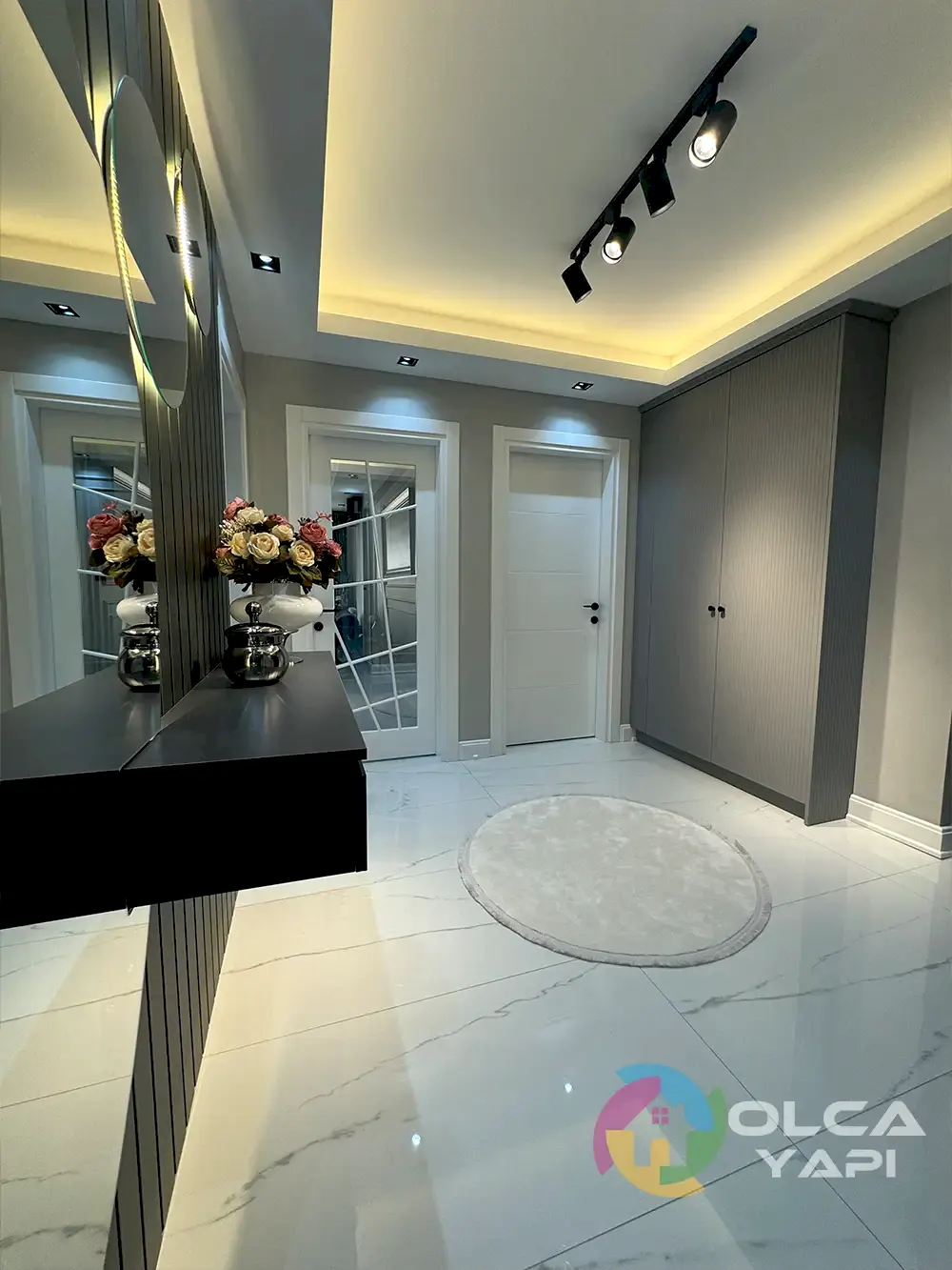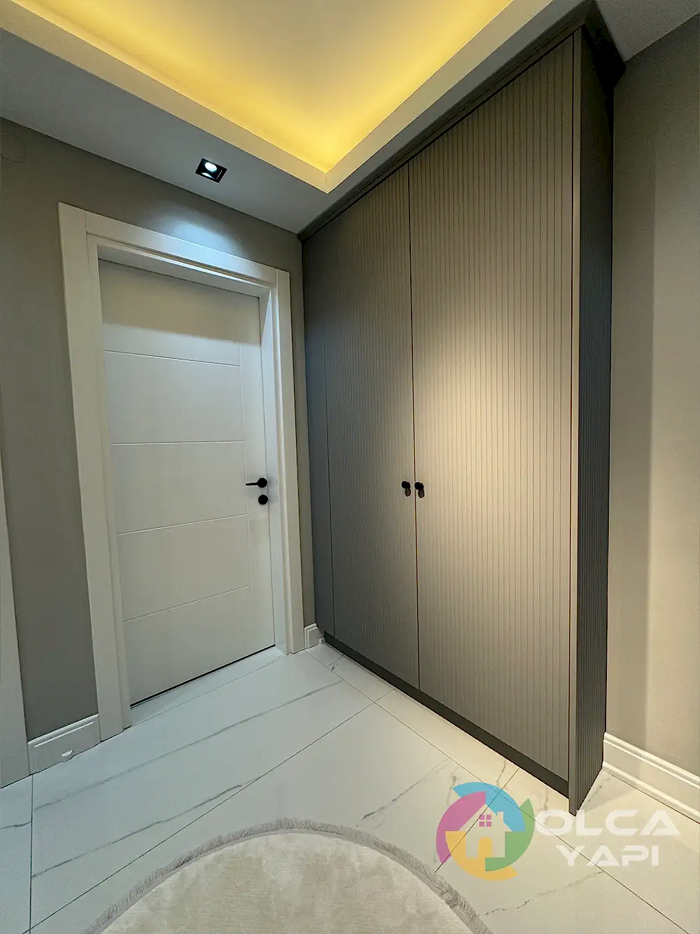 Antrede 2000 ST beyaz lake süpürgelik kullanıldı, antre ve salon için ışık bandı ve LED aydınlatma yapıldı. Asma tavan tamiratları gerçekleştirildi, salon ve antreye duvar çıta uygulandı. Antre için 190 cm antrasit renk MDF lam gövde ve çekmeceli dresuar yapıldı, gün ışığı LED aydınlatmalı aynalı olarak tasarlandı. Çamaşır odası ve ebeveyn banyosu için beyaz MDF lam tolere kapaklar kullanıldı.