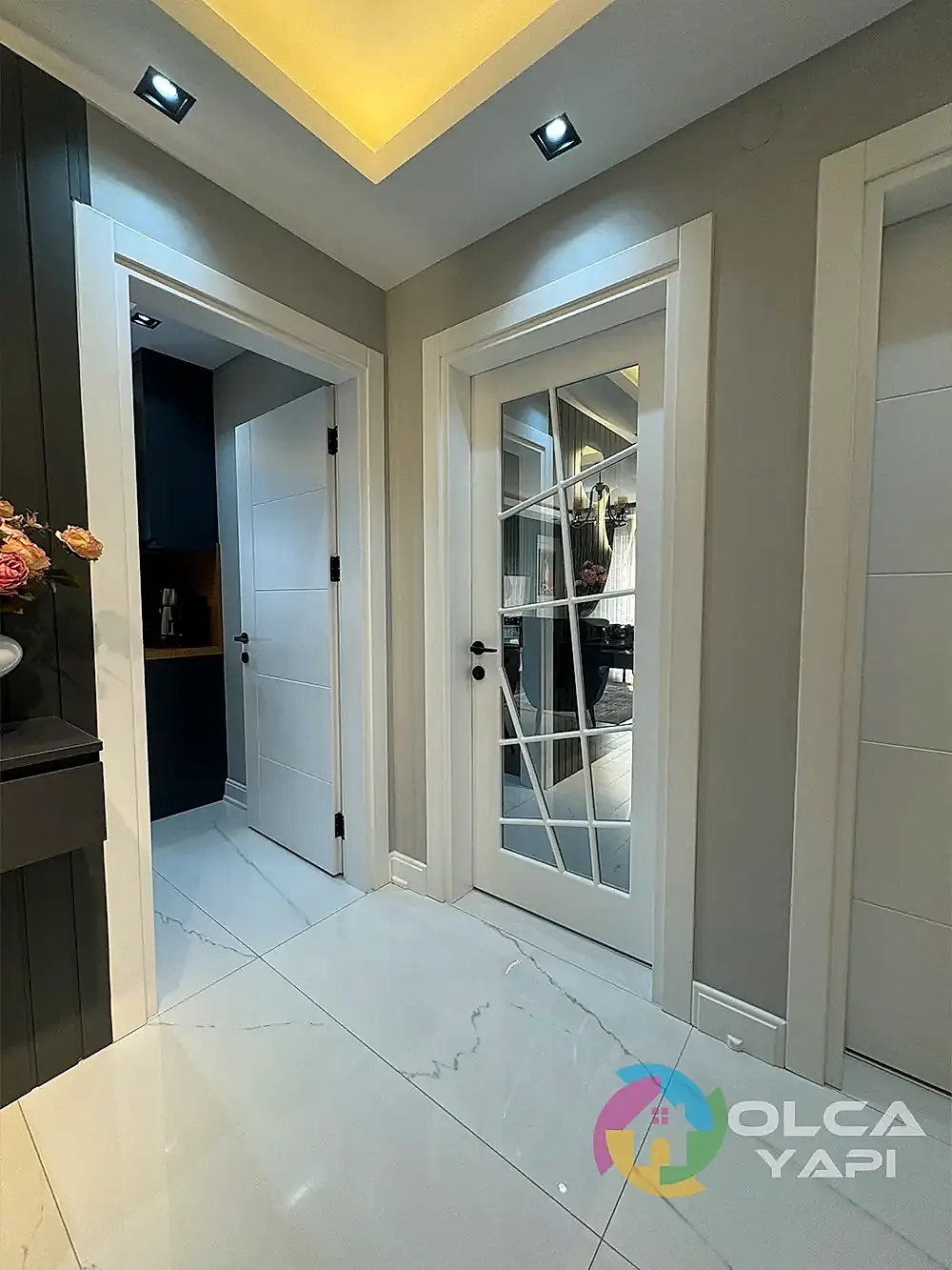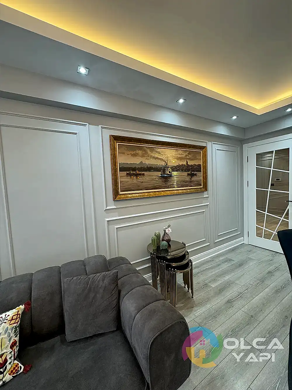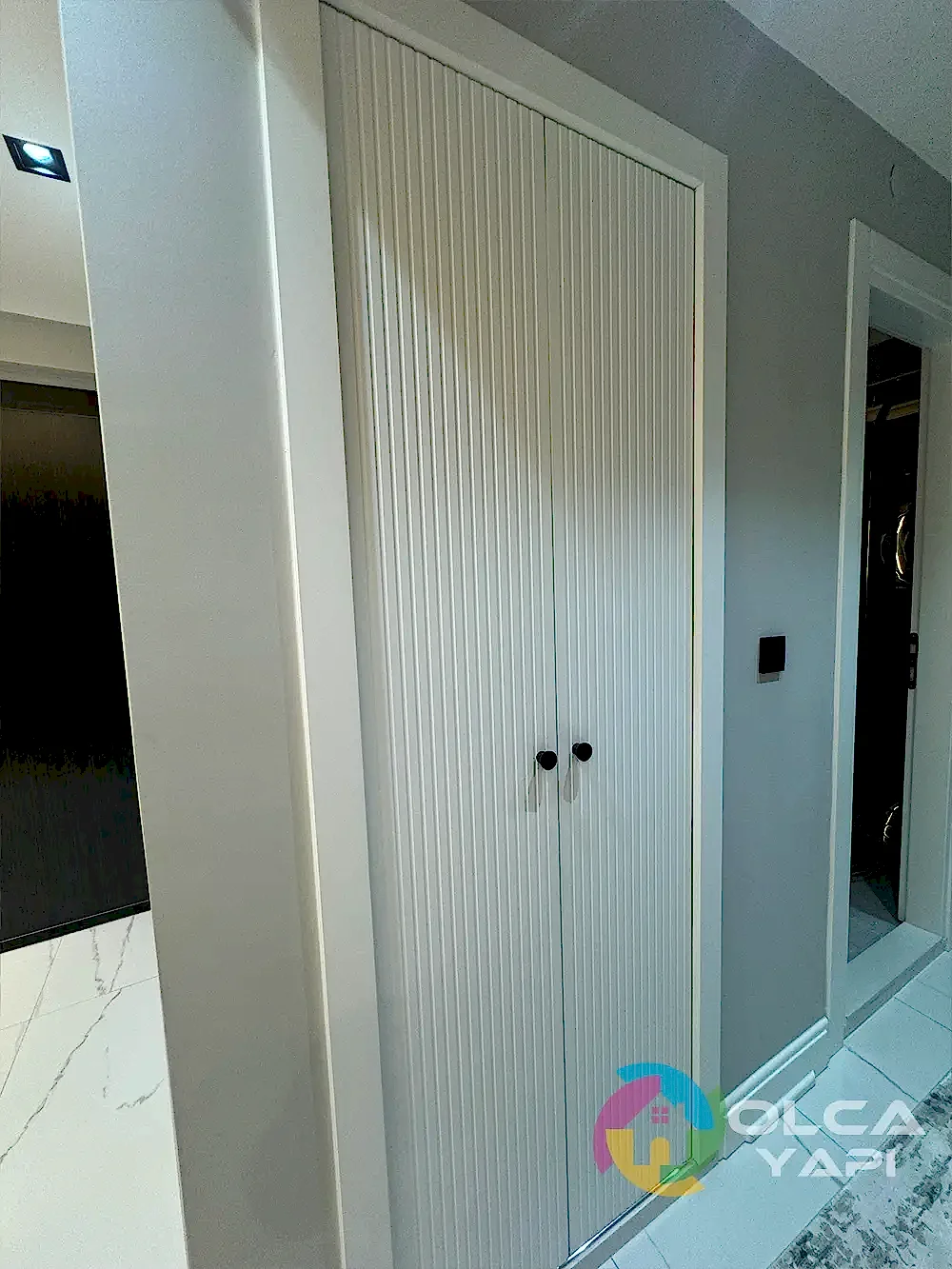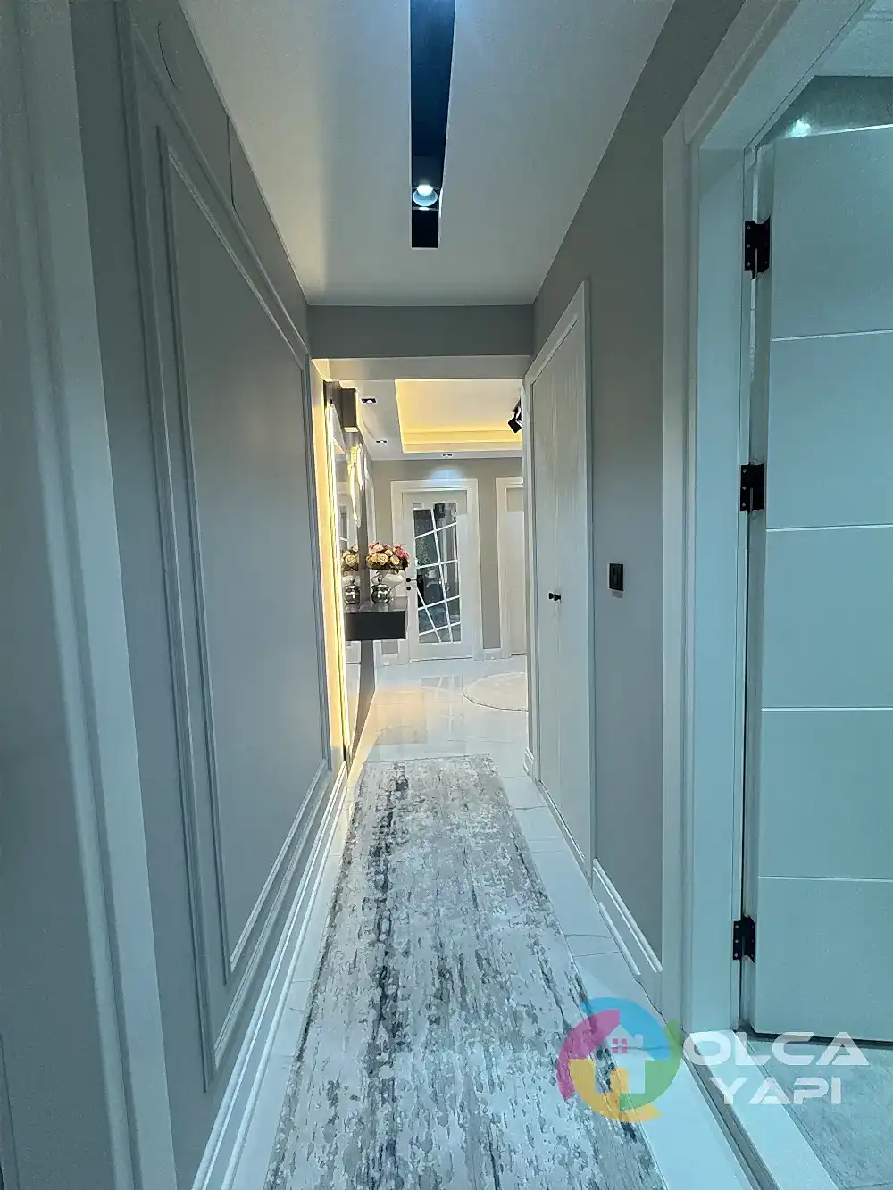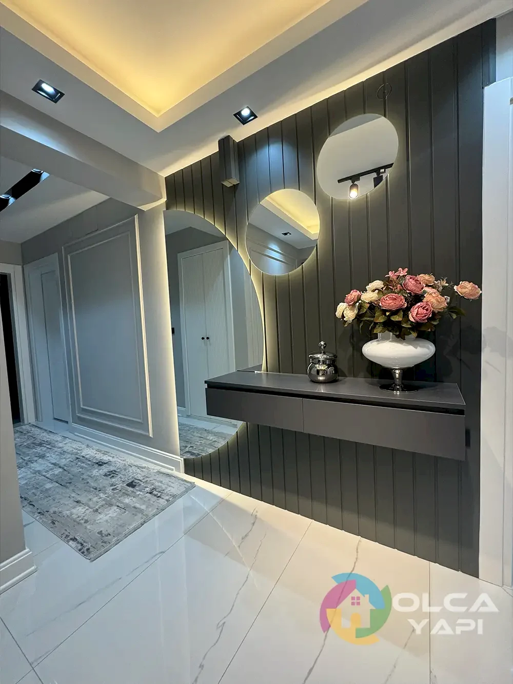 Antrede 2000 ST beyaz lake süpürgelik kullanıldı, antre ve salon için ışık bandı ve LED aydınlatma yapıldı. Asma tavan tamiratları gerçekleştirildi, salon ve antreye duvar çıta uygulandı. Antre için 190 cm antrasit renk MDF lam gövde ve çekmeceli dresuar yapıldı, gün ışığı LED aydınlatmalı aynalı olarak tasarlandı. Çamaşır odası ve ebeveyn banyosu için beyaz MDF lam tolere kapaklar kullanıldı.