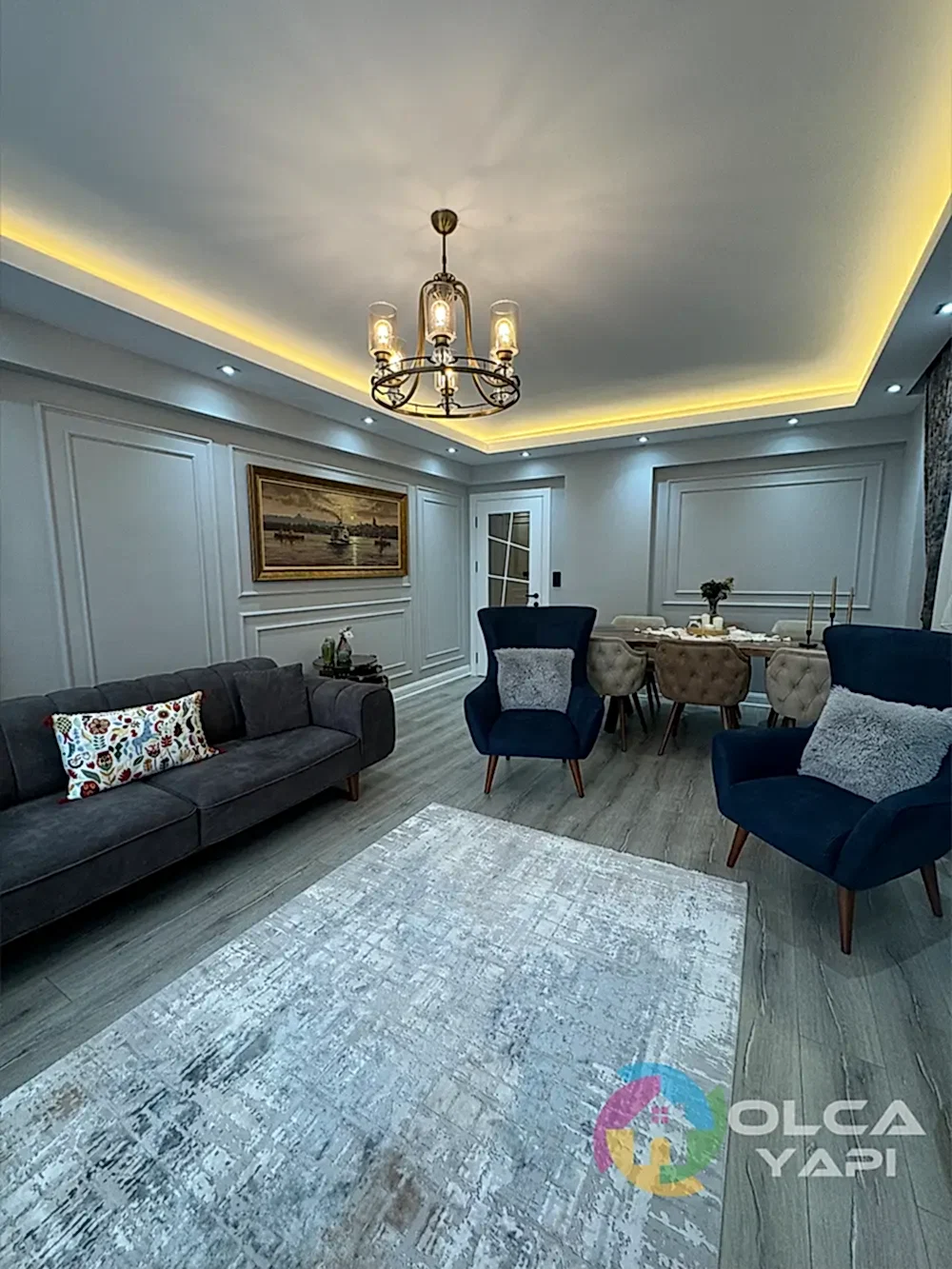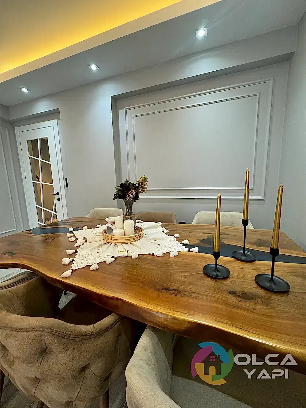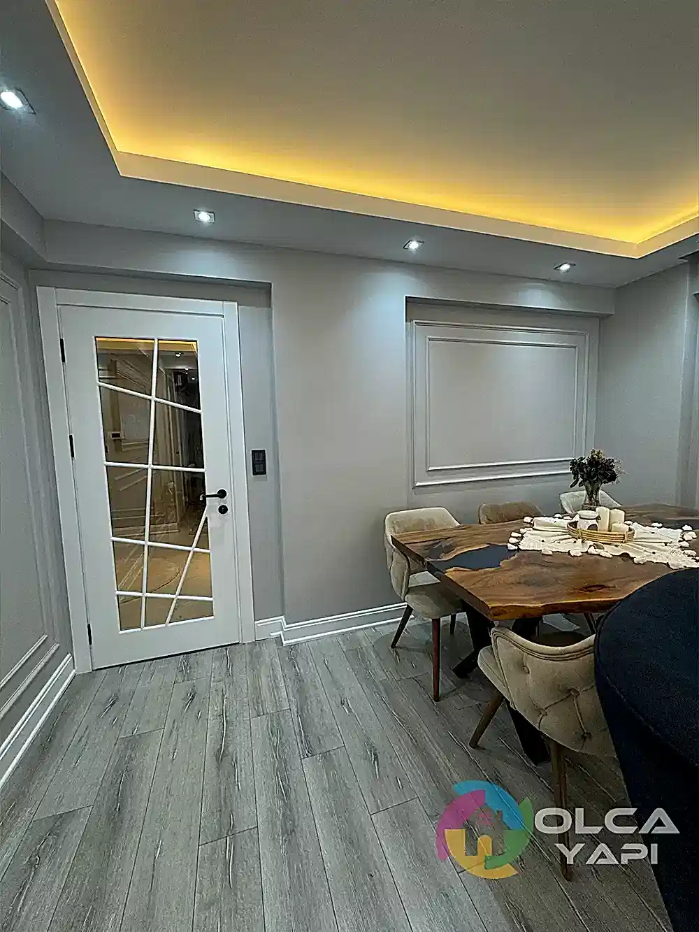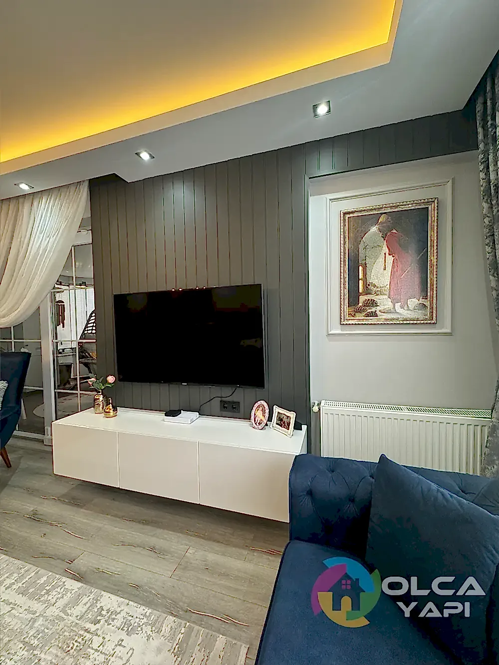 Antrede 2000 ST beyaz lake süpürgelik kullanıldı, antre ve salon için ışık bandı ve LED aydınlatma yapıldı. Asma tavan tamiratları gerçekleştirildi, salon ve antreye duvar çıta uygulandı. Antre için 190 cm antrasit renk MDF lam gövde ve çekmeceli dresuar yapıldı, gün ışığı LED aydınlatmalı aynalı olarak tasarlandı. Çamaşır odası ve ebeveyn banyosu için beyaz MDF lam tolere kapaklar kullanıldı.