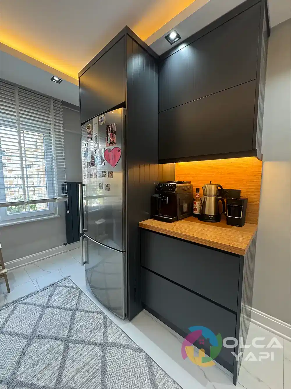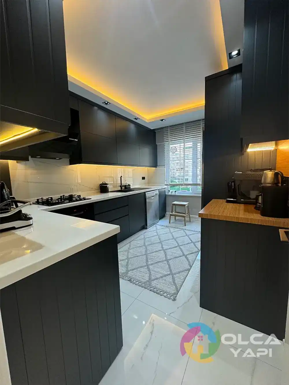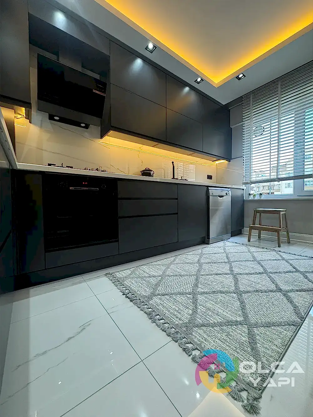 Kürşat Bey’in dairesinde kapsamlı bir tadilat gerçekleştirdik. Mutfak dolaplarını MDF lam gövde ve lake kapaklarla, kulpsuz ve 45 derece kesimli antrasit renk olarak tasarladık. Blume sistem kullanılarak işlevsellik sağlandı. Mutfak tezgahı Belenco Perla (suluksuz), tezgah arası ise 60×120 Kütahya Seramik Statuario granit seçildi. Franke 1.5 göz siyah evye ve siyah armatür monte edildi, gün ışığı LED aydınlatma eklendi. Mutfak ve antre zeminlerine 60×120 Kütahya Seramik Statuario granit döşendi.