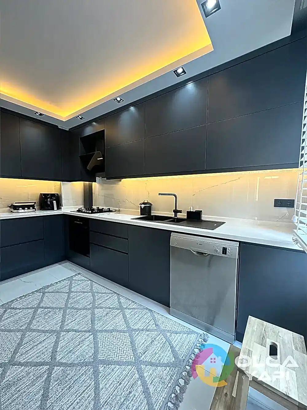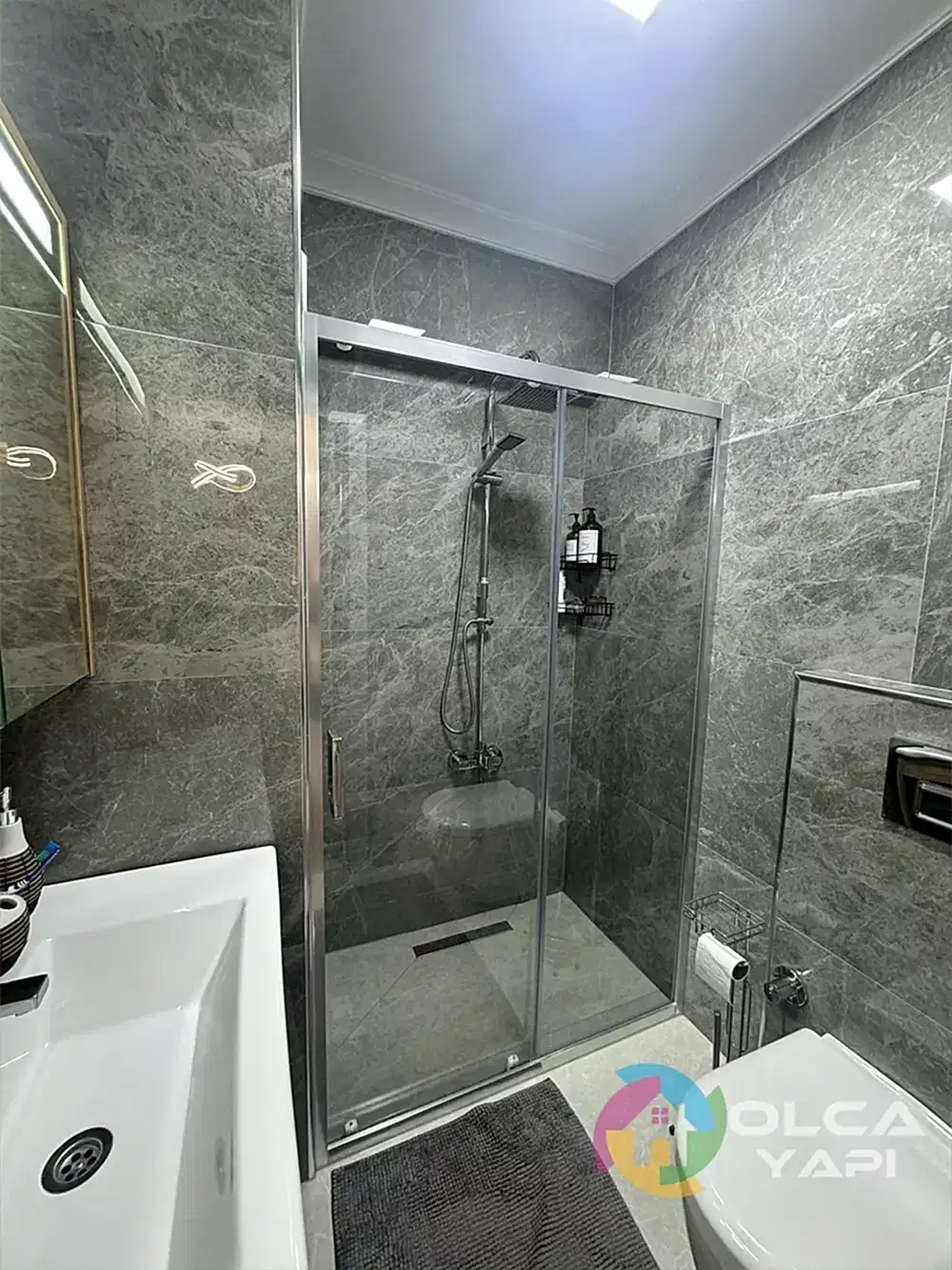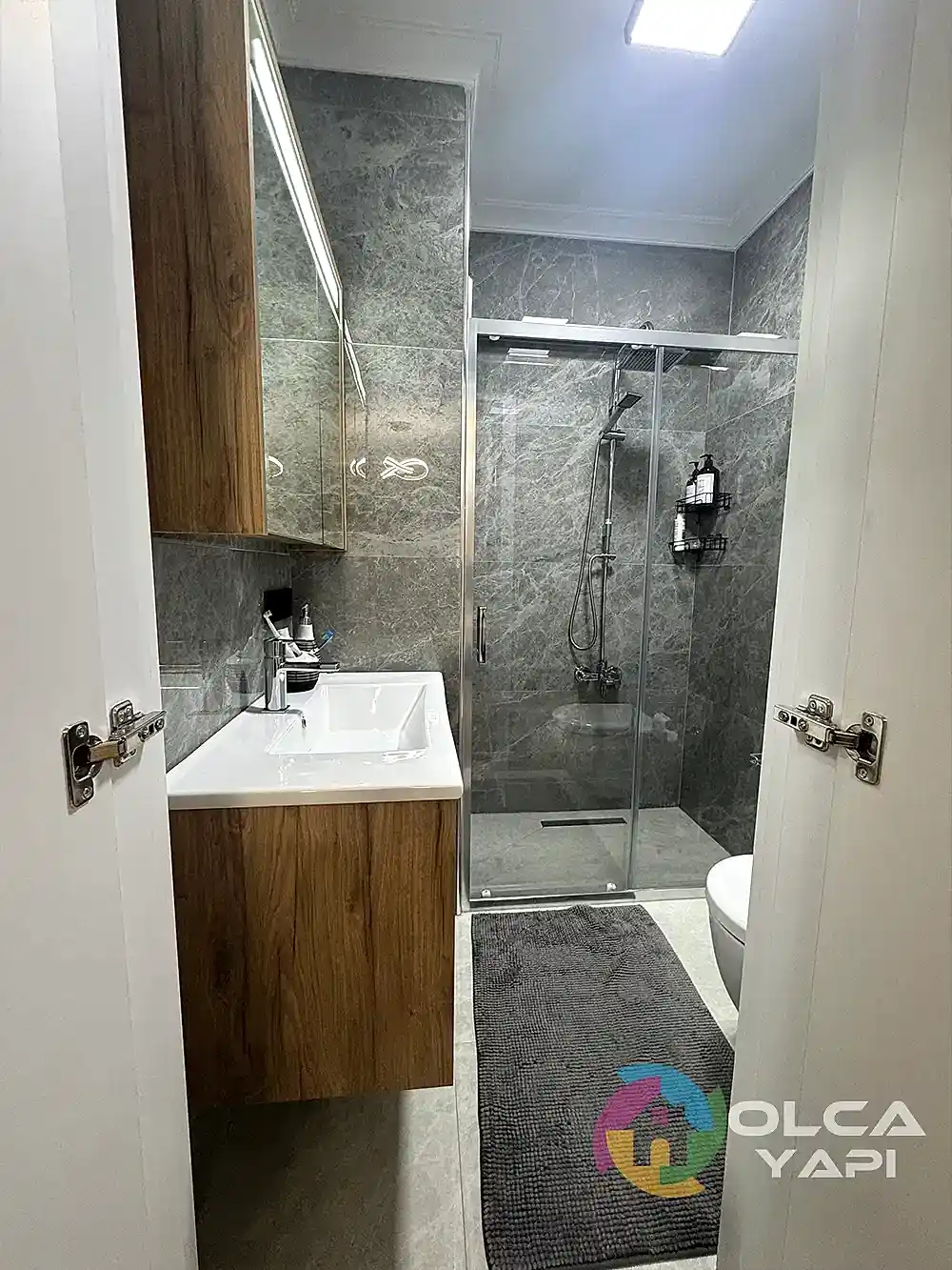 Kürşat Bey’in dairesinde kapsamlı bir tadilat gerçekleştirdik. Mutfak dolaplarını MDF lam gövde ve lake kapaklarla, kulpsuz ve 45 derece kesimli antrasit renk olarak tasarladık. Blume sistem kullanılarak işlevsellik sağlandı. Mutfak tezgahı Belenco Perla (suluksuz), tezgah arası ise 60×120 Kütahya Seramik Statuario granit seçildi. Franke 1.5 göz siyah evye ve siyah armatür monte edildi, gün ışığı LED aydınlatma eklendi. Mutfak ve antre zeminlerine 60×120 Kütahya Seramik Statuario granit döşendi.