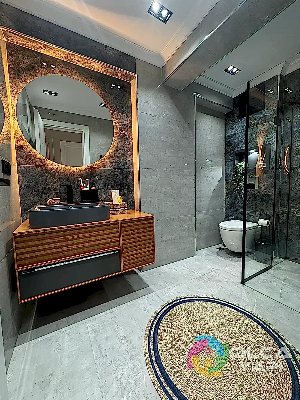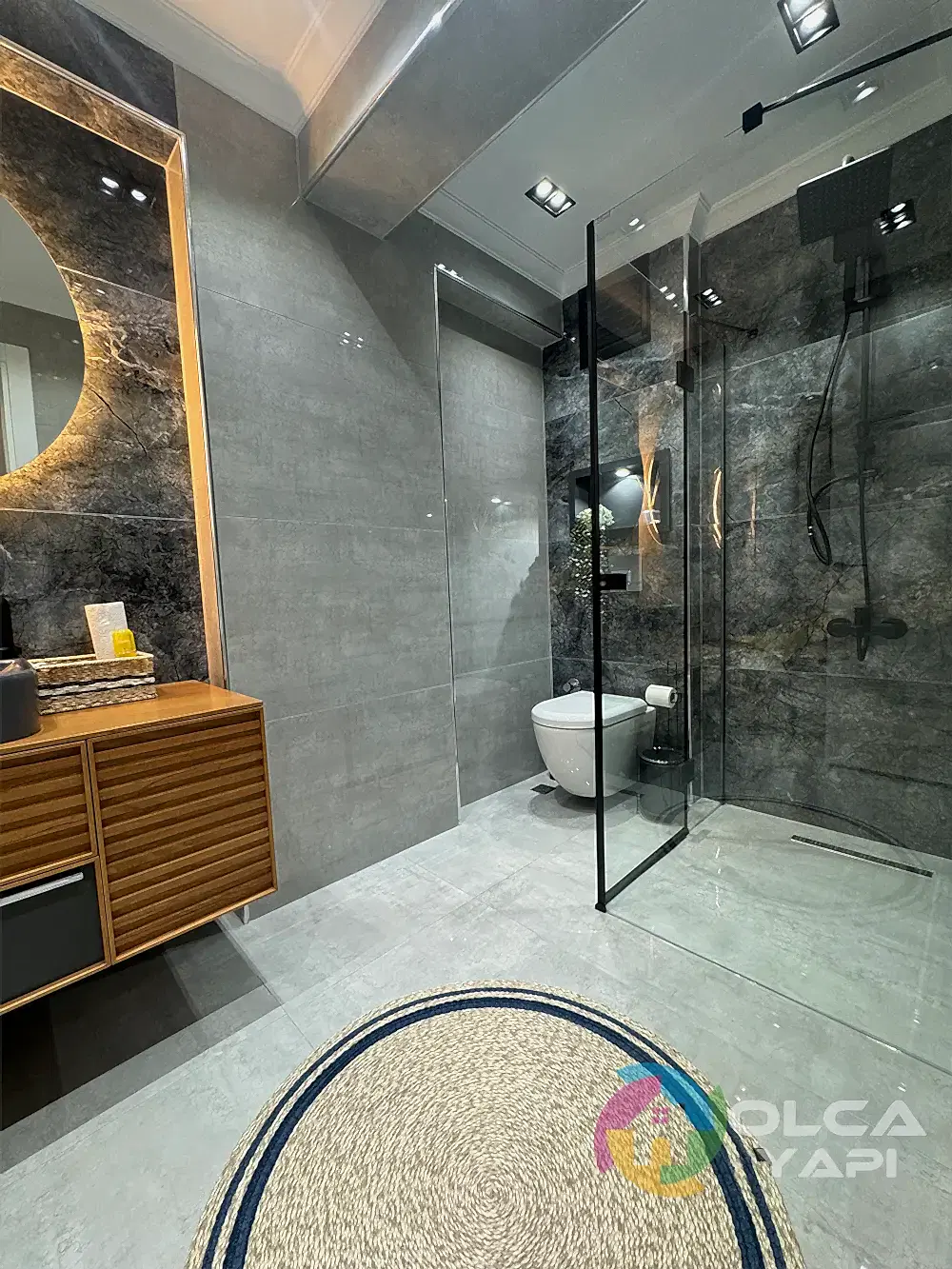 Lake iç kapılar (5 camsız, 1 camlı) ve antrasit lake kapaklı portmanto monte edildi. Banyo duvar ve zeminlerinde Kütahya Seramik Alaska gri ve Qua Seramik Martins Marble Dark kullanıldı. Ebeveyn banyosunda Kütahya Seramik Alaska gri ve Narsist gri seramikler tercih edildi. Banyoya Napoli 85 cm ahşap renk dolap, Artema Flo S krom ve siyah bataryalar, siva üstü tepe duş setleri (siyah ve krom), Vitra asma klozet ve gömme rezervuar takıldı. Duşakabinler ana banyoda siyah Sendero, ebeveyn banyosunda ise krom Karina olarak seçildi. Krom havlupan ve menfez eklendi.