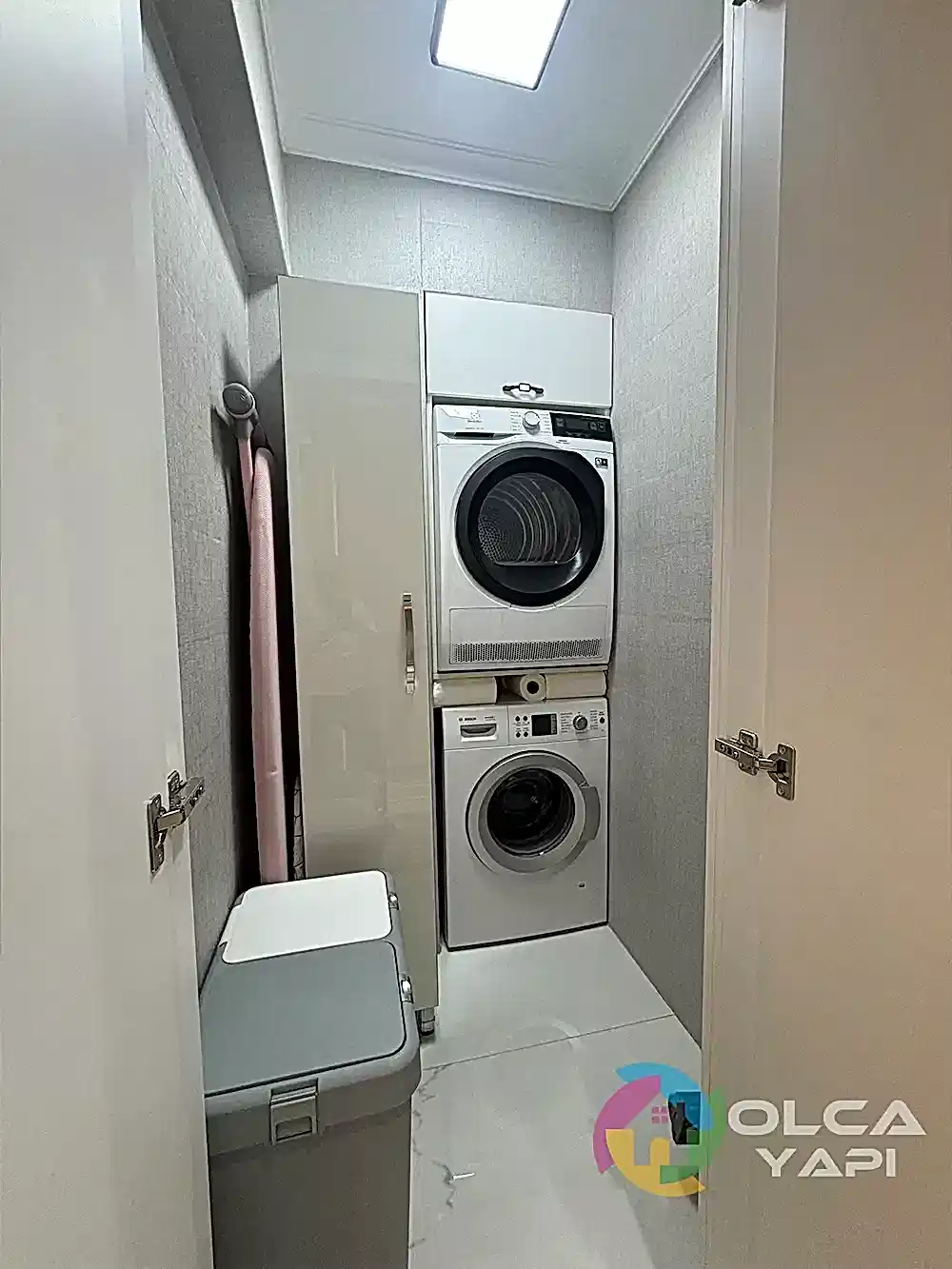 Çamaşır odasına duvar kağıdı (Tuşba 1001-4) uygulandı. Dairenin tüm tavan ve duvarları boyandı, su ve elektrik tesisatı yenilendi. Viko siyah prizler monte edildi. Kara sıva ve kırım işlemleri yapıldı. Seramik yapıştırıcısı, derz dolgu, kama klips, köşe çıtası, hammaliye ve moloz atılması gibi ek işlemler gerçekleştirildi. Banyoya siyah ve krom aksesuarlar eklendi.