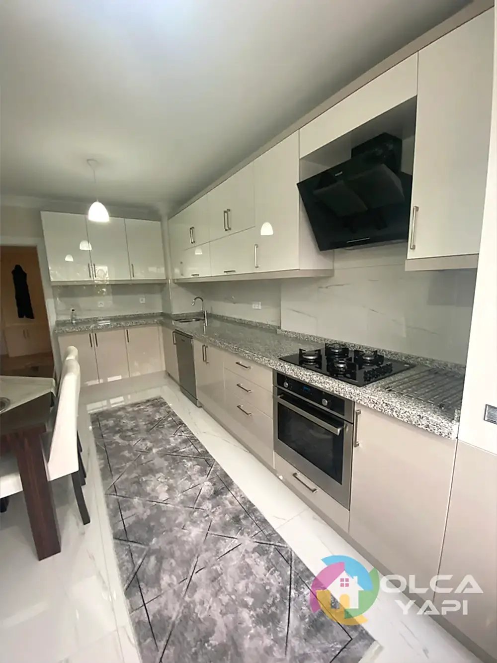 Olca Yapı olarak, Hakide Hanım’ın dairesinde kapsamlı bir tadilat gerçekleştirdik. Mutfakta dolapları kırıp, salonla arasındaki kapıyı sökerek duvar ördük ve petekleri kaydırdık. Doğalgaz tesisatını yenileyip, 2 adet yeni petek monte ettik. PVC pencereleri onarıp, 7 adet sineklik uyguladık. Tüm iç kapıları, prizleri ve süpürgelikleri yeniledik, duvarları ve tavanları boyadık. Zeminlere parke ve seramik döşedik, balkona cam balkon yaptık.