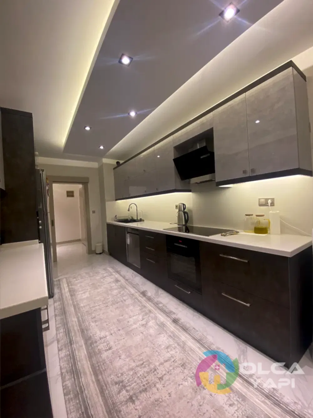Antre, balkon, mutfak, kiler ve çamaşır odası zeminlerine Kütahya Seramik 60×120 Armada granit döşendi. Kalan zeminlere AGT 32. Sınıf Tibet derzli parke ve 8 cm kendinden süpürgelik uygulandı. Antre, mutfak ve salona 10 cm lake süpürgelik (00422 – yeni gri) yapıldı. Mutfakta gövde MDF lam kapaklar highgloss dolaplar kullanıldı. Üst modül beton gri, alt modül, boy modülü, ada, taç, bant, baza kumlu beton olarak tasarlandı. Dört adet kiler sepetli çekme sistemi eklendi. Çimstone Artemis suluksuz tezgah ve tezgah arası uygulandı.